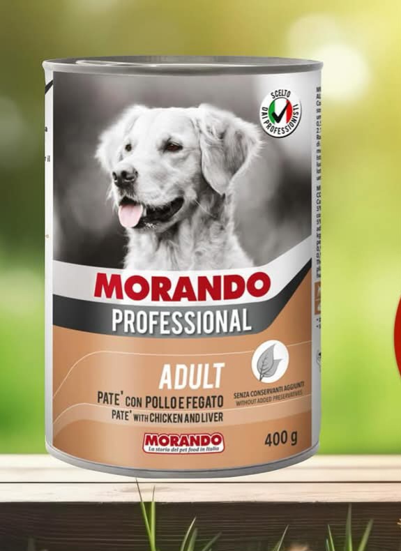 Morando canned dog food is made in Italy and is designed to provide a balanced diet for pets. Morando dog food contains cereals, meat, vegetable derivatives, oils and fats, minerals, and yeasts.